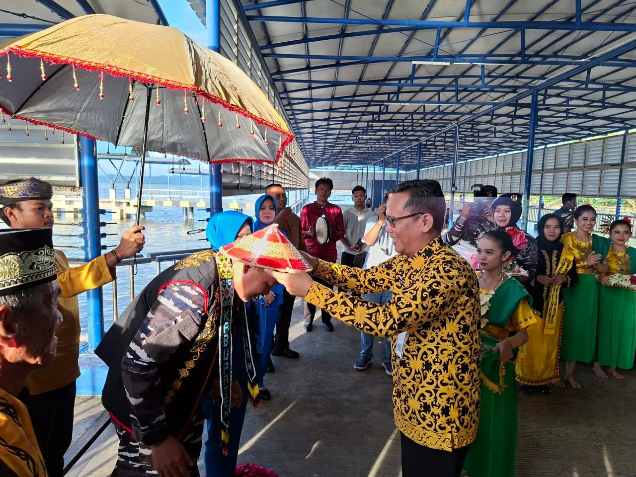 Begitu melangkah turun dari speedboat, rombongan Danlanal langsung disambut tarian khas dari Sanggar Busak Malay. Sebagai simbol penerimaan warga perbatasan, Pj Sekda Raden Iwan mengalungkan selempang manik bermotif ukiran Lulantatibu. Ia juga mengenakan saung basung—kerajinan tradisional Dayak Lundayeh asal Krayan—kepada sang kolonel dan istri.