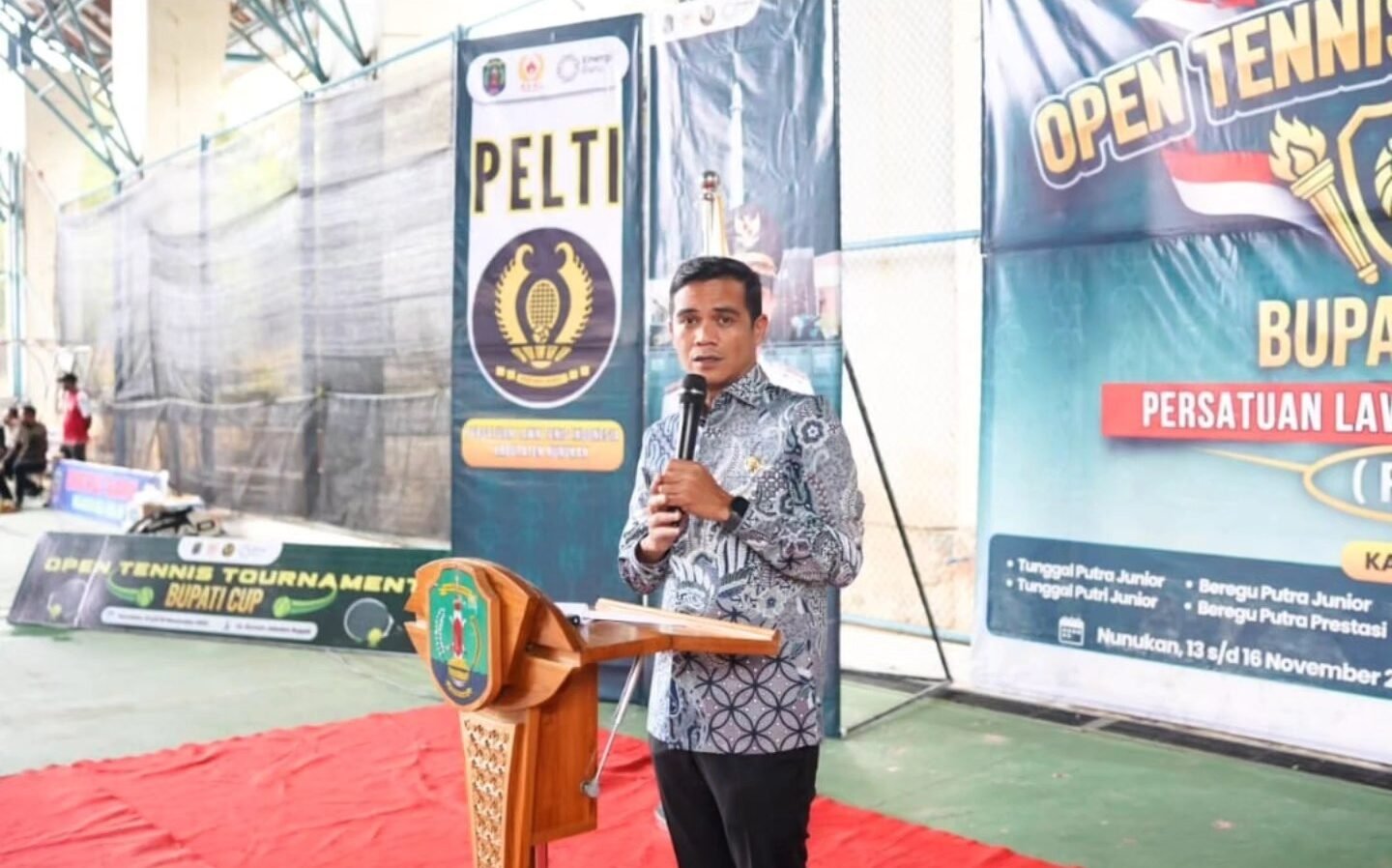 NUNUKAN – Bupati Nunukan, H. Irwan Sabri, S.E, secara resmi membuka Open Tournament Bupati Cup Tenis Lapangan Tahun 2025 yang diselenggarakan oleh Persatuan Lawn Tenis Indonesia (PELTI). Pembukaan ditandai dengan service pertama oleh Bupati di Lapangan Tenis Rumah Jabatan Bupati, Jl. Ujang Dewa, Kamis (13/11/25).